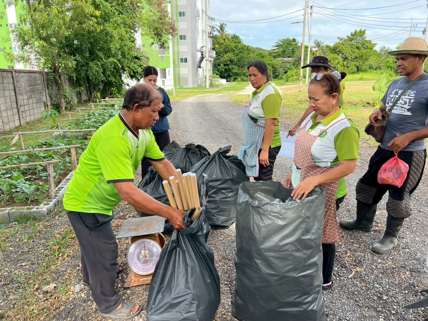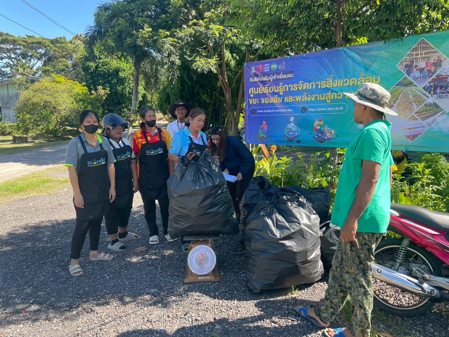 บรรยากาศภายในงานเป็นไปอย่างคึกคัก ตั้งแต่ช่วงเช้ามีนักศึกษาและชาวบ้านในชุมชนใกล้เคียง ทยอยนำขยะรีไซเคิลที่รวบรวมไว้มาต่อแถวชั่งน้ำหนัก โดยทางศูนย์ฯ ได้กำหนดอัตราแลกเปลี่ยนที่ชัดเจน เช่น ขวดพลาสติกใส 1 กิโลกรัม สามารถแลกผักบุ้งหรือผักกาดได้ 1 ถุงใหญ่ สร้างรอยยิ้มและความพึงพอใจให้กับผู้เข้าร่วม